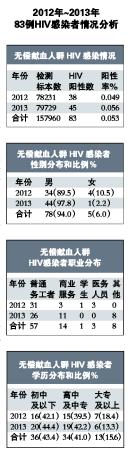 今年年初,央视曾报道福建一名5岁女童因在医院输血感染艾滋病病毒的事。不久前,东莞市中心血站公布了对2012年~2013年全市无偿献血者的标本检测结果,发现有83例HIV感染者,其中3例是医务工作者。