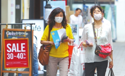 6月16日,在韩国首尔,人们在明洞商业区购物。新华社发