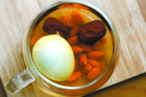 材料(1人分量)和做法:黑枣5颗,鸡蛋一个,枸杞子15克,加水适量煮15分钟即可。