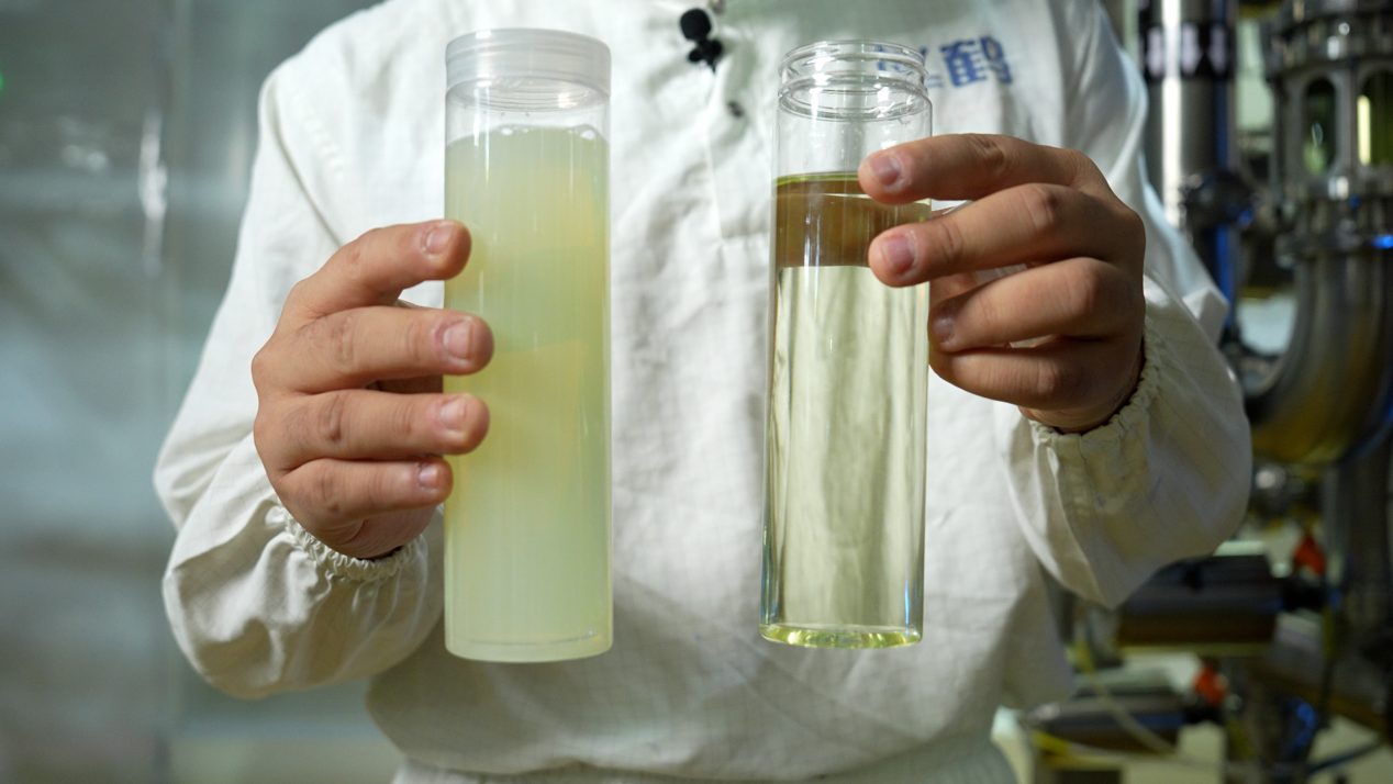(右侧为飞鹤自产新鲜乳清蛋白液。相较传统工艺,飞鹤自产乳清蛋白液的新鲜度、纯净度更优。)