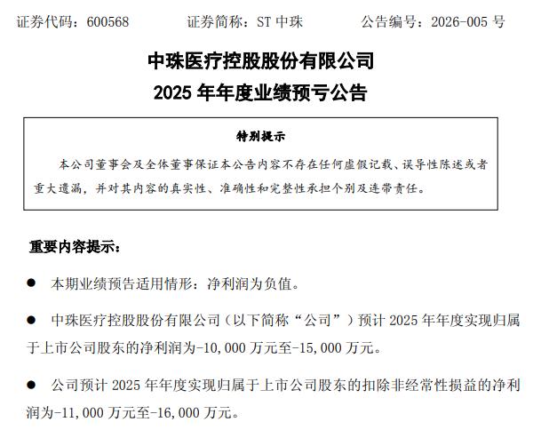 1月23日晚间,中珠医疗控股股份有限公司(以下简称“中珠医疗”)发布年度业绩预亏公告:预计全年归属于上市公司股东的净利润亏损1亿元至1.5亿元,扣除非经常性损益后亏损1.1亿元至1.6亿元。
